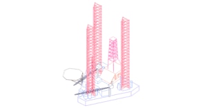 Perro Negro 4 is a jack-up for offshore petroleum researches. It has three legs that, during field transit and ocean tows, are entirely raised up. In case of bad weather they can be partially lowered (depth allowing) and/or disassembled to increase metacentric height.
