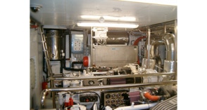 • Central engine room with structural fuel and black water tanks, two entrances from superstructure sides