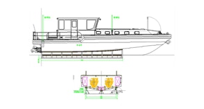 At first we proposed two powering versions: with Hamilton water jet propellers, as requested by MMI, and with Sea Rider surface propellers and rudders; in fact we believed this one the best solution in order to satisfy the requested speeds at the very different foreseen load conditions. We also proposed the possibility to build the hulls with light alloy, because they were only four, so the fibreglass moulds would have weighed upon the costs.
