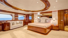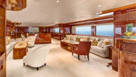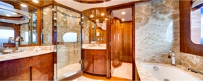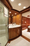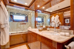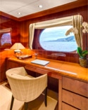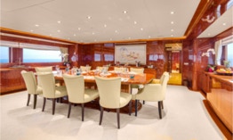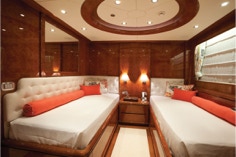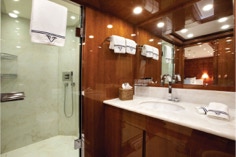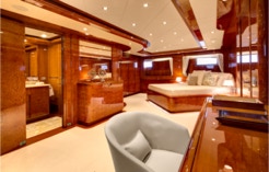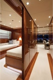 The interiors layout has been studied to ensure the best comfort to the guests and the most rational use of the spaces destined to the crew. The capacious engine room, which accommodates two MTU 12V 2000 M60 engines with a power of 600 kW @ 1800 rpm each and three Onan 80 kW generators, is supplied with a air conditioned and sound insulated control room; this allows the crew to monitor the working of all the machineries from a comfortable space.