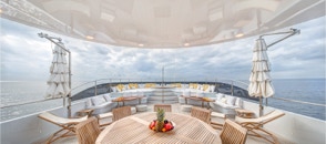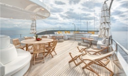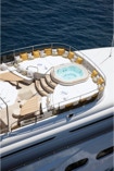 A poppa, dietro ad una zona relax esterna con ampio divano, si trovano una gru e il tender principale, che funge anche da battello di soccorso; sull'estrema prua, oltre le attrezzature d'ormeggio, vi sono la gru e il tender di servizio o le moto d'acqua.