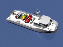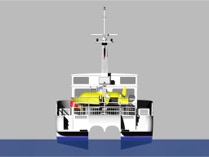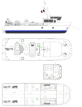 It is thrusted by two waterjets in order to minimize the draft and to be able to sail in shallow sandy waters with algae and mangroves. Also the engines refrigerating system has been studied to work in shallow and “dirty” waters.