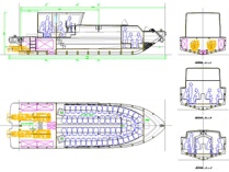 At first we proposed two powering versions: with Hamilton water jet propellers, as requested by MMI, and with Sea Rider surface propellers and rudders; in fact we believed this one the best solution in order to satisfy the requested speeds at the very different foreseen load conditions. We also proposed the possibility to build the hulls with light alloy, because they were only four, so the fibreglass moulds would have weighed upon the costs.